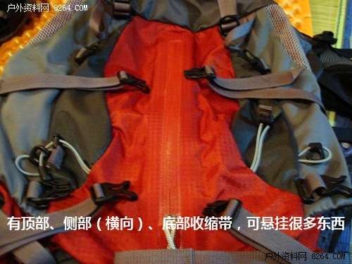 Z35R具有顶部、侧部(横向)、底部收缩带,可以悬挂很多东西。包的横向收缩带的设计很人性化。两边的卡扣都是一公一母,这样在包的前面悬挂