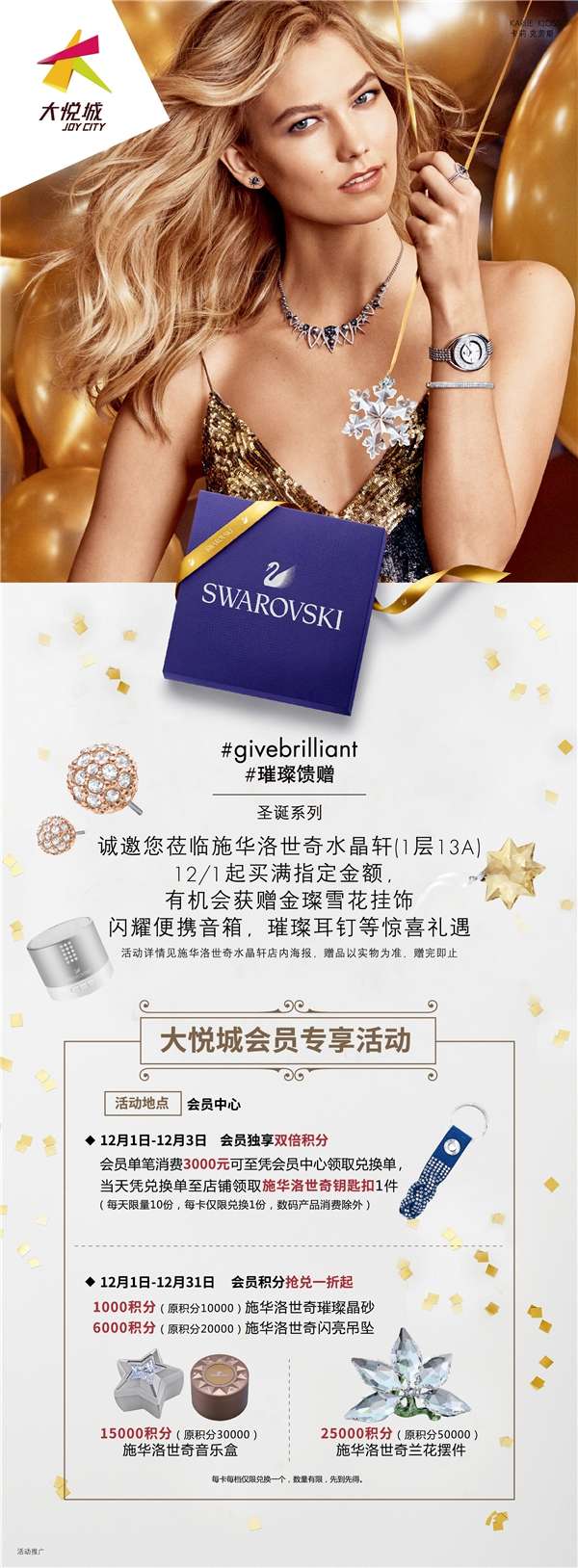 今年的璀璨圣诞树,以施华洛世奇2016秋冬“晶璨银河”系列FIZZY项链为灵感,在传统圣诞树基础形状之上,将一颗颗晶莹剔透的繁星错落有致地悬挂于高达14米的树身,炫彩光芒,灿若星空。金色底座、金色气球和缎带装饰带来喜悦的节日氛围;银色流线型LED灯带盘旋而上,与数十万颗镶嵌仿水晶、仿水晶串珠相映生辉;树冠的2016限量雪花造型更显明澈澄湛。12月1日至1月3日期间,每天14点到21点期间逢整点,“璀璨圣诞树”都将准时点亮。星雨闪烁,光影灼灼,优雅绚丽的首饰与光影幻灯曼妙结合,承载希望,传递祝福,为这个圣诞带来别具一格的美妙体验!