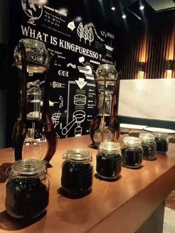 在上海的大益茶庭全球研发中心,由大益勐海茶厂资深茶专家、上海年轻的茶咖师、以及多名饮料及食品研发经验的产品经理共同组成的黄金研发团队,从数十款大益普洱原料中甄选,从更早工业化制成标准的咖啡制备程序中寻找灵感,利用半自动的可变压萃取机,配合专门研制的茶手柄,现场萃取出普洱茶的精华,浓缩成一杯滋味浓郁的普洱茶基浓缩,以其特有的浓酽,适和与蒸奶、奶油等融合,通过上百次千次的调制与反复的口感测试,成为具有黄金比例配方的现代茶饮。研发团队将这款品质恒定、口感独特的产品命名为“金普芮(kingpuresso)”。