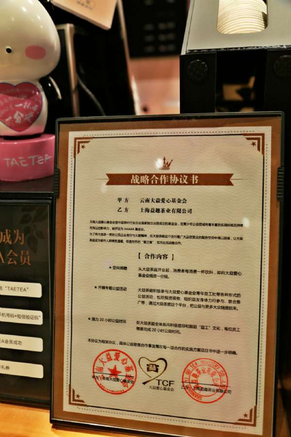 每售出一杯茶,即向大益爱心基金会捐出一分钱。