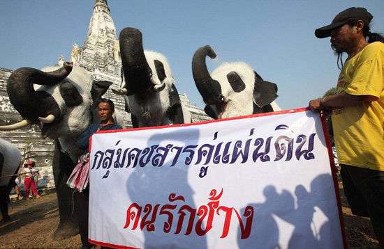 大象组织Elephantstay日前在泰国南部大城府(Ayutthaya)皇家象园村举行了名为“1600只熊猫”的国际设计展览,此次展览中,Elephantstay工作人员将3头大象扮成了熊猫模样成功吸引了游客们的眼球。