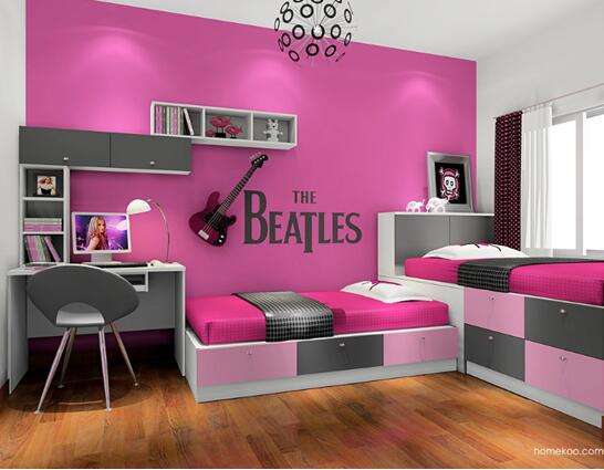 这儿童双人房以释放自我,就爱摇滚为主题,张扬的色调搭配,配上摇滚的主题,是个性张扬女孩的最爱。双人床的巧妙拼搭,以及两站书桌单独分开的设计,既充分利用了空间,且不会互相干扰。