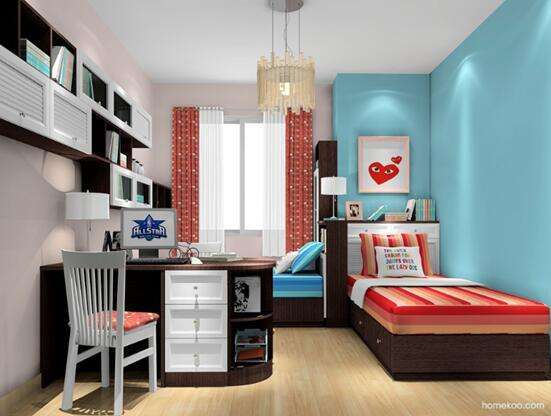 两铺床的巧妙拼搭,大大的增加了空间的储物收纳性,突出儿童房的特点。即使是一个小男孩和一个小女孩,也能同住一间房。红色与蓝色的搭配,同时满足了男孩和女孩的喜好。书桌与吊柜的拼搭,大方美观,非常实用。