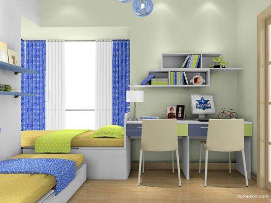该儿童双人房利用转角飘窗,设计为榻榻米的床,不仅满足双人房的要求,且储藏功能强大,使小空间也能拥有双人房。双人书桌,空间充裕,互不影响。