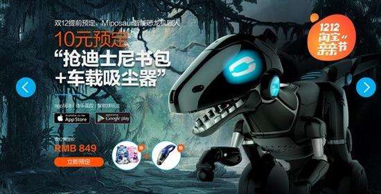 12月1日—12月11日,10元即可预订 Miposaur智能恐龙,前100名预订者即可获赠价值268元迪士尼书包,双12当天前1小时支付全款者还可获赠价值399元车载吸尘器。