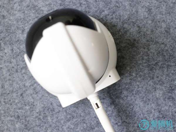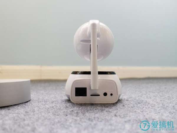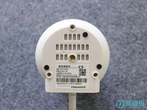 所有的功能开孔都位于智能摄像机平台底座的后侧,分别有RJ45 10M/100M自适应以太网口、标准TF卡卡槽、电源插孔和RESET复位键。在wifi网络复杂的环境中,以太网口插入网线可以保证智能摄像机的稳定工作,个人接的这种设计非常有必要。云视通智能摄像机C5最大支持64G存储拓展,可以保障半个月左右的视频存储,基本可以满足95%以上的用户群体需求;长按RESET键可以完成机器出厂设置。云台的右上角的小孔是内置MIC,功能主要用于双向语音通话和远距离拾音,这颗MIC可以实现6米远距离拾音,只要合理布局摄像机的摆放位置,最终可以实现全房间的声音监控。