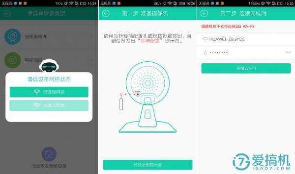 之后会出现如上图片的弹窗,新用户选择 “未接入网络”选项,按照操作提示依次进行。此处应该注意,图片长按设置键按钮这是示意图,具体设置键的位置以具实物机型为主,例如智能摄像机C5的RESET键位于云台后侧。第二步选择接入的无线网络,大家选择网络时一定注意云视通智能摄像机C5不支持5G wifi,切记不可选错,否则无法绑定。