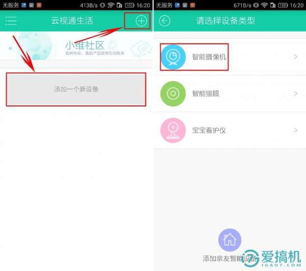 想实现手机远程操作智能摄像机必须将app与智能摄像机绑定,具体绑定流程如下:在app首页点击添加一个新设备或右上角“+”,选择自己拥有的设备智能摄像机。