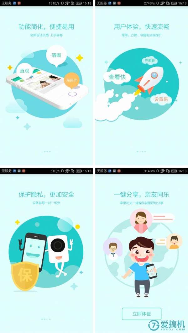 云视通生活app的页面设计也传承了简约温馨的风格,首次登陆的四张banner图充分诠释了云视通智能摄像机的理念与服务:便捷、流畅、安全、共享,在之后的文章中你会充分感受到这种理念和服务意识。