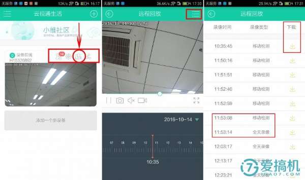 视频回放功能的查看还可以通过首页的摄像机图标计入,点击第二幅图片红框的选项可以查看所有回放录像,而且可以选择把回放录像下载到手机中备份,避免小偷偷走摄像机无法留下证据。