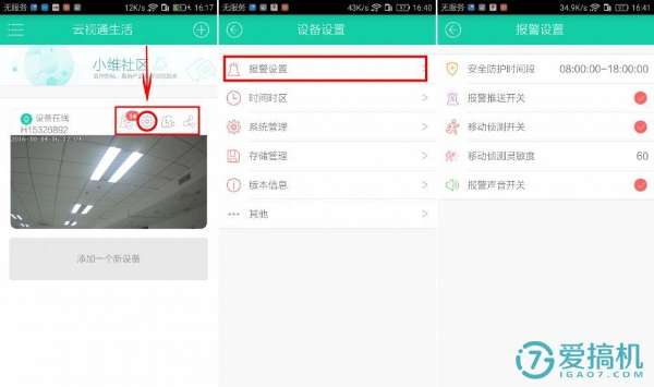 报警功能应该是用户购买智能摄像机最关心的功能,具体开启方法如下:在app首页点击红色圆圈的设置键,选择报警设置,根据自己的需求可以设置安全防护时间段、报警推送、移动侦测、移动侦测灵敏度设置和报警声音开关,其中报警声音为摄像机主动发声功能,当不法分子潜入你家中被摄像机侦测到时,摄像机会开启警报声音,一定程度会吓退不法分子,保证财产不受损失。