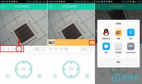 点击首页添加的设备即可进入设备在线视频观看和功能管理,图中的照相机logo是抓拍按键,点击一次可以完成一次抓拍,抓拍后的照片会在手机端进行存储,同时也可以将抓拍的图像分享给好友或者网络上。
