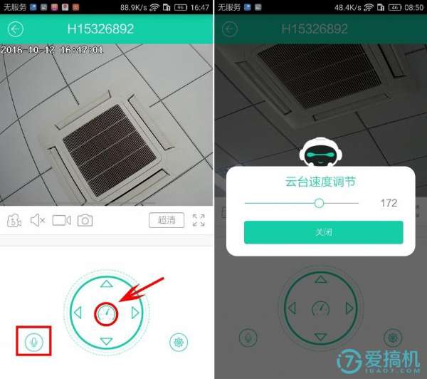 点击左下角图标可以实现云台控制和实时语音对讲功能的切换,云视通智能摄像机C5的云台操作水平支持355°旋转,垂直支持85°旋转,都可以通过作图的方向按钮进行控制。而且云台的旋转速度也可以自主设置,想快想慢由你做主。
