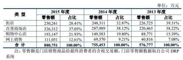 招股书显示,太平鸟服饰在街店的零售额持续增长,但销售占比逐年下降;百货店零售额相对稳定;购物中心店的零售额也逐年上升,从2013年的88771万元增长至2015年的193147万元,年均复合增长率为47.51%;电商业务增长迅猛,网上销售实现的零售额从2013年的40816万元增长至2015年的111051万元,年均复合增长率为64.95%。