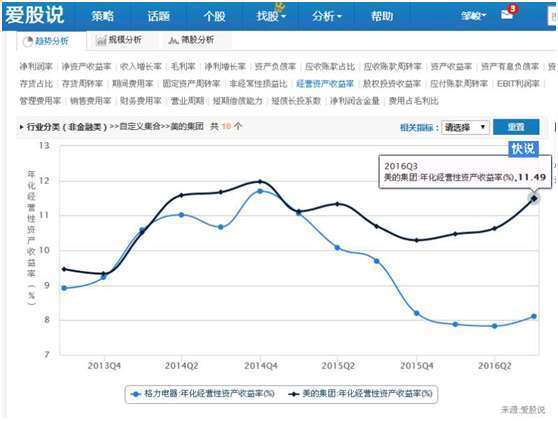 再看上图的经营资产收益率,美的明显比格力强,趋势明显向好,这说明作为白色家电主业的两家企业,美的主业盈利能力要强过格力电器。因此,从盈利能力综合考量,美的资产盈利能力要强于格力。