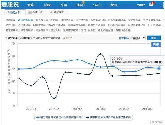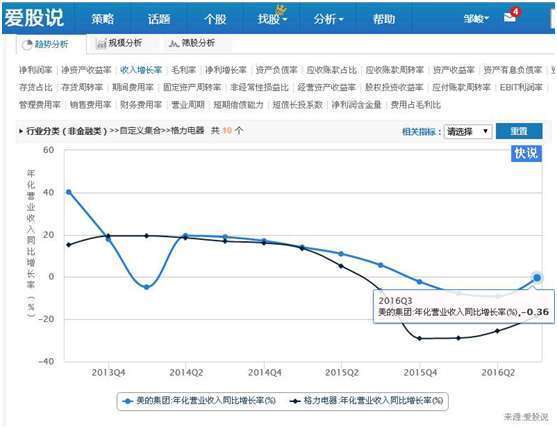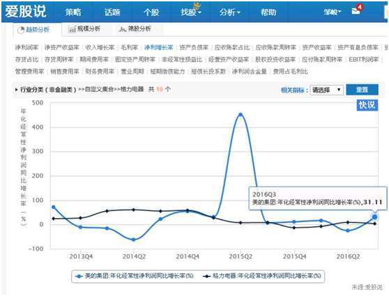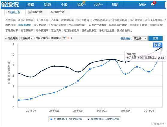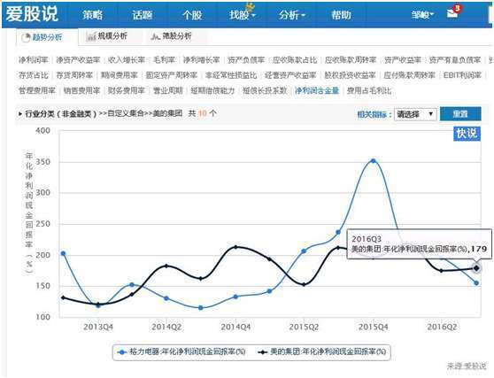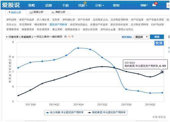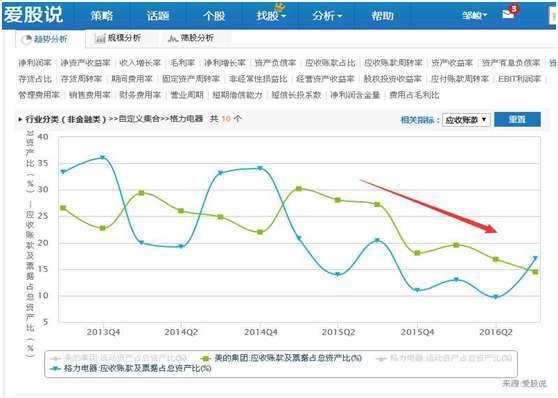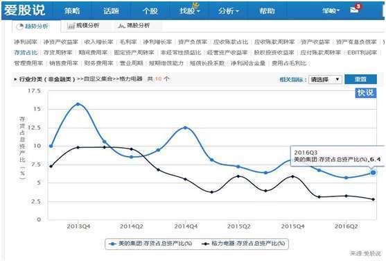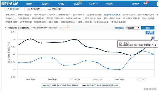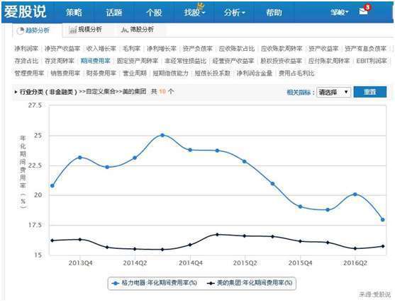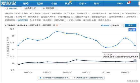 上图可以看出,在我们策略分析功能界面,应用销售费用率指标进行分析,发现原来是美的销售费率出现扩张而导致费用率上升,而管理费用率以及财务费用率都是下降的,因此,美的应该是市场出现需求,增大销售费用开支,因而导致费用率上升。从市场需求的角度看,这是个好现象,因为市场有需求,所以才会加大市场推广,导致销售费用的上升。
