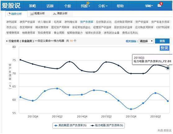 从资产负债率看格力是72%,比美的59%的资产负债率高出不少。