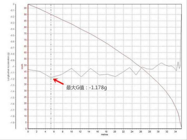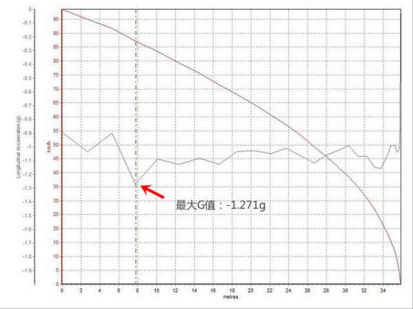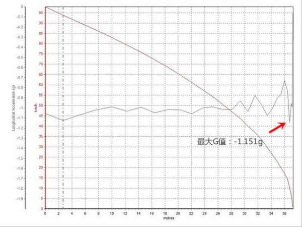 刹车距离为38.9米,减速力度始终保持稳定,最大减速G值达到-1.151g。