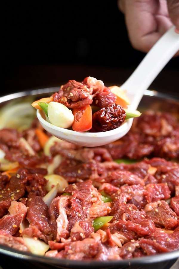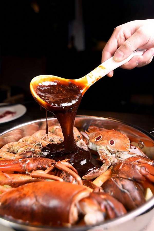 焖锅的味道完全来自那浓稠如膏的酱汁,而黄记煌特制酱汁其实不只3种,特地前来督军的黄记煌行政主厨王保军表示,如今黄记煌的酱汁已有8种,这回到台湾开店则带来了5种,分别是:原味经典汁、麻辣汁、海鲜汁、豉皇汁和特调汁,所有酱汁都是从原味经典为根本,再加入其它食材香酱料调制。而原味酱汁则是用猪鸡骨加了蔬菜和蚝油、酱油、海鲜酱都熬煮制成,并勾芡浓缩。