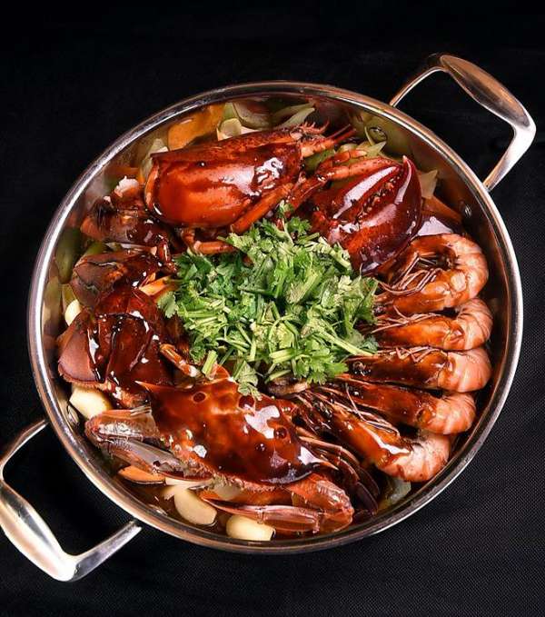 〈豪华拼盘〉焖锅内的食材很丰富,内有梭子蟹、斑节虾、半尾波士顿龙虾,以及厚切安格斯牛小排肉片。(图/姚舜摄)