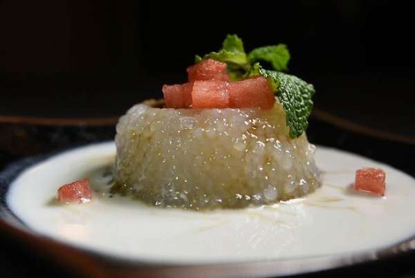 〈椰汁西米露〉的造型立体,上面还用了红色西瓜丁点缀。(图/姚舜摄)