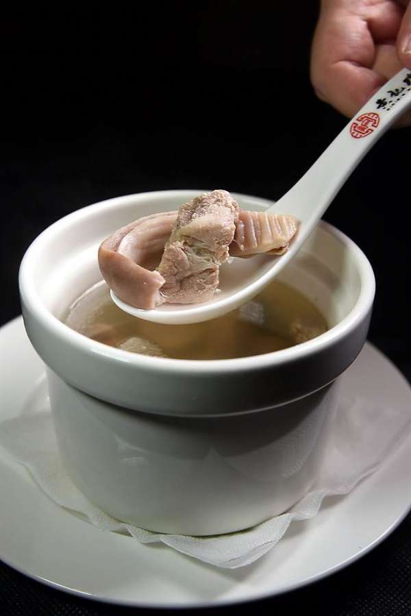 现点现炖的〈猪肚排骨汤〉,汤色清浅、汤味鲜浓,每盅90元。(图/姚舜摄)