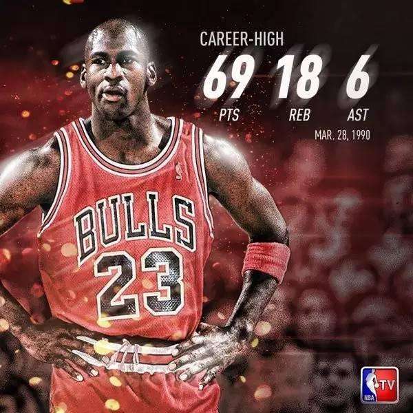 在1990年公牛对阵骑士的比赛里,在“禅师”杰克逊的指教下,乔丹全场37中23,拿下69分18个篮板,得分和篮板数据都是生涯最高,整个赛季乔丹场均33.6分+6.8板+6.3助。