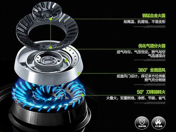 燃气灶采用50°四维双旋火焰设计,燃烧的火焰形成双旋燃烧的完美结构面,使燃烧的热量集中于锅底,得到最充分的利用,省时又省气。