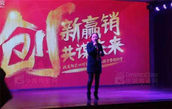 紧接着,欧美陶瓷四川分公司经销商代表上台热情地分享了这年来的经营心得、经历分享,她从从店面管理、团队打造、展厅布置、销售技巧等方面生动展示了如何打造强势终端运营体系,他的演讲给现场的所有家人们非常大的启发和激励。
