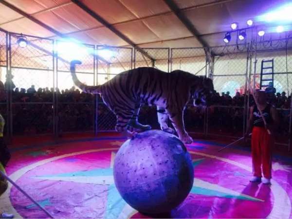 当老虎站在球体上,会发生什么?一只威风凛凛的东北虎,站在它的玩具大球上,在驯兽师的指挥下,滚动大球,为现场观众带来精彩的表演。