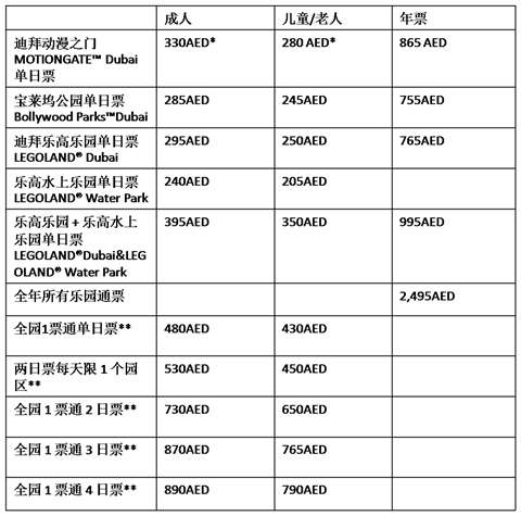 *标识注释:由于迪拜动漫之门(MOTIONGATE? Dubai)还有一部分娱乐设施还在改进,这个票价是全部开园的票价,现阶段票价为成人240AED,儿童和老年人210AED。**标识注释:该类门票有效期为7天。关于迪拜乐园及度假村2016年开业后,迪拜乐园及度假村(Dubai Parks and Resorts)成为中东地区最大的综合主题乐园,内部包括三所独立的主题乐园,分别是:以好莱坞电影为主题的迪拜动漫之门、迪拜乐高乐园,中东第一家乐高乐园、中东地区首家迪拜宝莱坞乐园(Bollywood Parks? Dubai),将还原宝莱坞重磅电影场景。同时,乐园内还有中东首家乐高水上乐园(LEGOLAND? Water Park),面向有2-12岁小朋友的游客们。迪拜六面旗乐园将是迪拜乐园内的第四家主题乐园,也是中东地区第一家六面旗主题公园,预计2019年年底开园。整个迪拜乐园景区由Riverland?Dubai连接,这是一个集购物、餐饮、娱乐为一体的休闲区域。在这里,客人们可以入住Lapita酒店(Lapita? Hotel, Marriott Autograph? Collection),Lapita酒店是万豪集团旗下的茗品精选酒店品牌,这家度假村具有浓厚的波利尼西亚风情,适合家庭入住。迪拜乐园及度假村(Dubai Parks and Resorts)位于 Sheikh Zayed Road,对面是杰贝勒