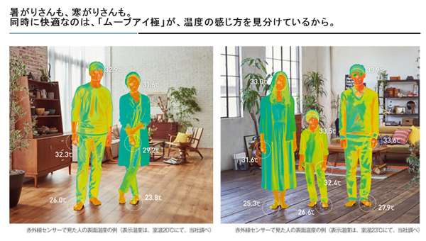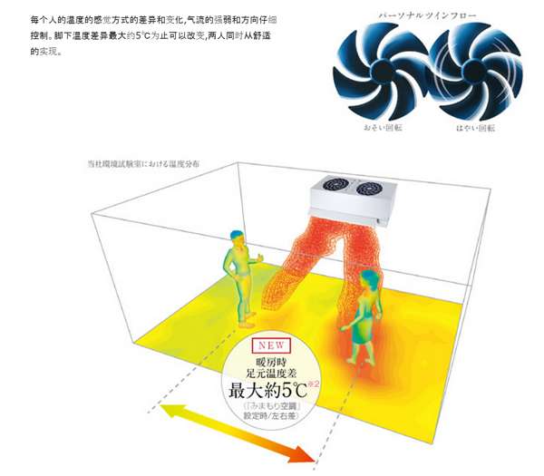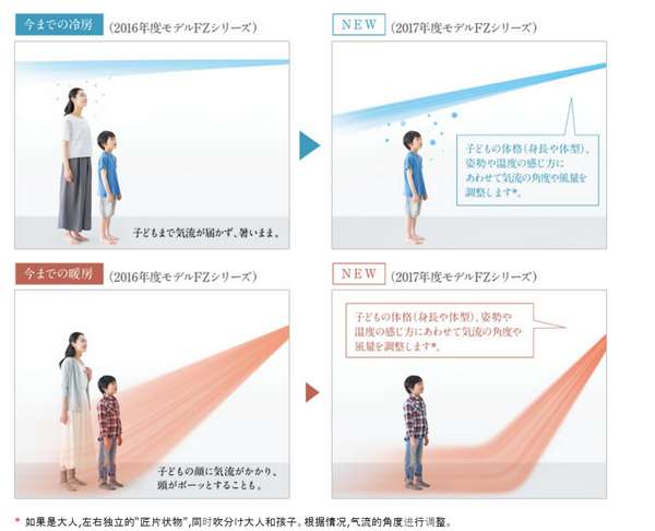 FZ系列进化了人感检测系统,可以将人体温度测量精度达到0.1度,精确感知室内人体的温度,通过内部多个导风板及双轴流风扇,进行个性化定制送风。今年的升级款可以将儿童和大人进行更加精准的区分,将送风做的更为精确,保证了大人和儿童都能享受舒适温度。冬季制热时,也能将热气直接送到脚下,室内有两个人在时,也可根据人体温度需求,送出不同的热风,两人最大送出温度可相差5度。一台空调能够产生两种温度,也是将人感送风做到了极致。
