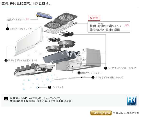 为了缓解空调房内皮肤干燥的问题,FZ系列搭载了新型的“清水雾”功能,可以达到以往空调最大6倍的保湿效果,不仅可以美容皮肤,还能养护秀发。目前还不清楚“清水雾”功能是否需要人工加水,还是像大金乌鲁鲁那样从室外获取水汽(会日淘大家电的小伙伴可以联系我,买一台回来拆了就知道) 。值得一提的是双风扇控制,奇葩到连窗子下面的冷气都能够送热风进行温度综合。空调内部也采用了业界首创的不粘油污设计,滤网自动扫除功能也是必须的,升级款尤其强调了在保证滤网自动扫除静音性的同时进行高速运转。