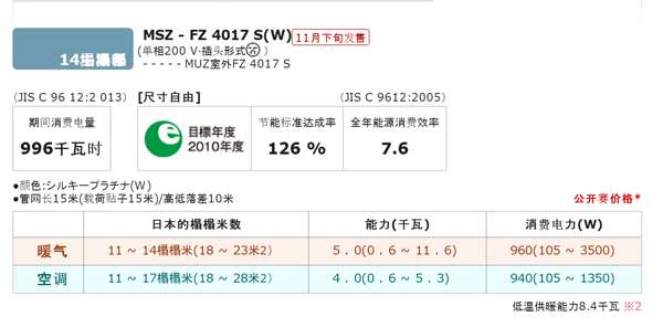 目前额定4KW能力的机型在日本乐天的售价约为323244日元(约19444元)。而在国内方面,今年国内三菱电机召开了两场发布会,在10月12日召开的第二场发布会上发布了将会在2017年年底上市对应日本的FZ系列产品,同时确定了会在今年年底上市对应日本FL系列的JL系列产品,不过目前尚不清楚这个年底指的是公历新年还是农历新年。