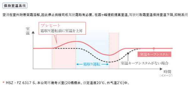 主要性能参数上,低温制热的能力达到了8.4千瓦(室外2度),室外0度时,额定能力下仍然可以吹出60度的高温风(非最大能力下)。不过比较遗憾的是,最新的FZ系列并没有配备旁通除霜/蓄热除霜等技术,室外低于0度时,仍然会进行切换化霜(室内变成制冷,室外变成制热,搬运一部分室内的热量给室外热交换器化霜)。