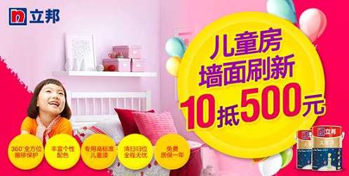 在过去的“六一”儿童节,立邦携手聚划算、天猫,宣告儿童房刷新服务正式上线聚划算、天猫,为消费者提供“环保产品+刷新服务”的单房涂刷组合套餐,呵护孩子在各个成长阶段健康成长,为他们营造一个多彩、丰富快乐的童年环境。这是立邦刷新服务继今年3月联合天猫家装达成独家战略合作之后,再度携手聚划算、天猫开展的深度合作,彰显了立邦进一步进军儿童房O2O家装市场的决心。