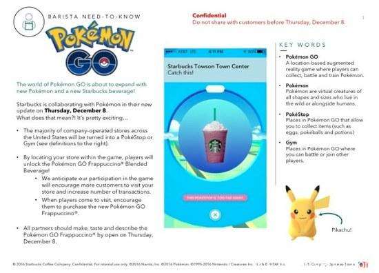 据悉,此次《精灵宝可梦GO》和星巴克的合作将使得星巴克的图标出现在《精灵宝可梦GO》的地图之中,星巴克则需要支付一笔不菲的赞助费。同时星巴克还专门设立了一个主题Frappuccino,会推出新的星巴克饮料,如果有玩家进入到星巴克的店内抓精灵除了能够提升捕捉精灵的几率外还有可能解锁一杯《精灵宝可梦GO》版的Frappuccino饮料,当然这种饮料也能用现实中的钱币买到。