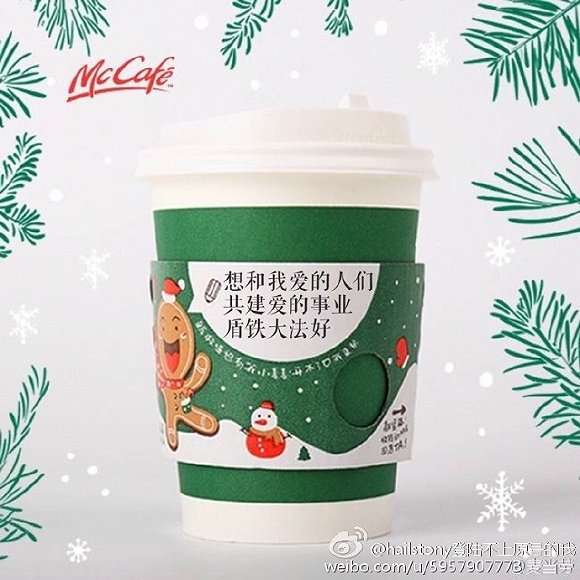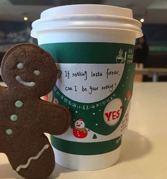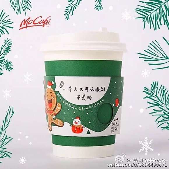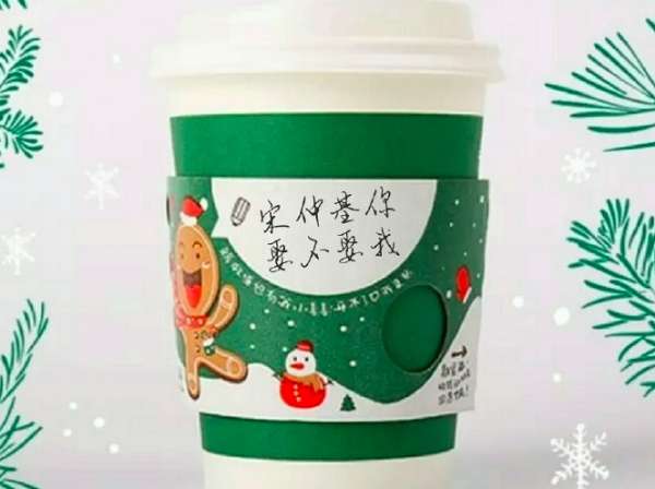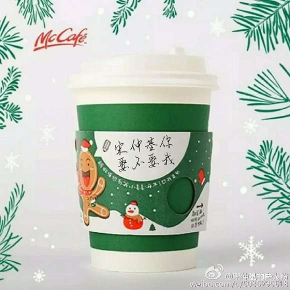 12月7日,麦当劳旗下的麦咖啡就推出了一款可以对话的圣诞“传情杯”。这款杯子的设计相当调皮可爱。印着姜饼人和雪人图案的绿色纸杯套上有个空白处,可以写下难以开口想表白的话。在杯套下方有一块圆形缺口,旋转杯套就会露出杯身上印着的话——“Yes”和“No” 。