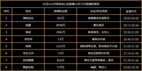 红豆Live“问答挑战”公益直播,不仅邀请到著名演员姚晨、国际著名钢琴家郎朗、知名演员柳岩以及青年大提琴演奏家欧阳娜娜助阵,也吸引了微博CEO王高飞、畅销书作家李笑来、科普大V@博物杂志、知名编剧史航、情感作家陆琪、知名营养师顾中一等超过60位大V、名人主动参与。网友可在直播中通过付费提问功能提问问题,每位明星、大V需至少回答十个问题。