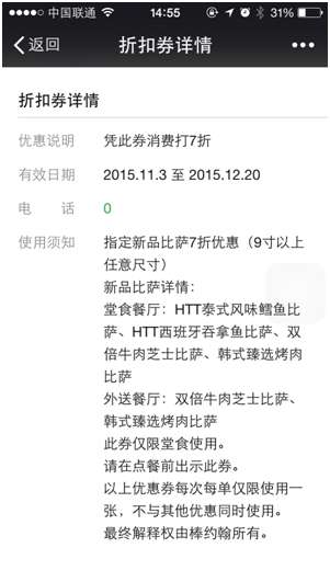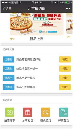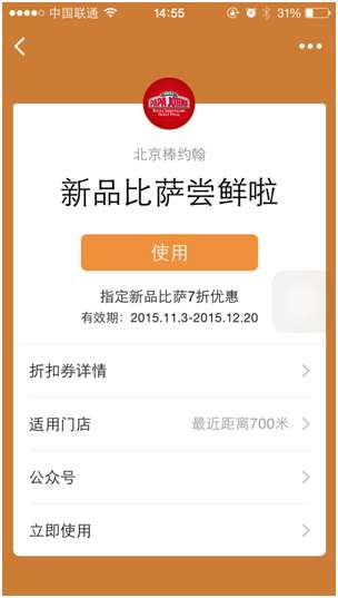 据介绍,此次棒约翰接入鲜老虎适逢菜品出新,因此棒约翰在卡券制作上主推新品折扣券,西班牙那吞鱼比萨,泰式风味鳕鱼比萨等新品比萨都可以享受到独有的折扣,再加上鲜老虎的分享礼包给好友功能,瞬间将棒约翰的新品折扣卡券发满朋友圈。