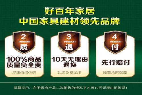 ??除了体量、品质、优惠、服务的保证,张总在采访结束前夕还表示,南宁好百年家居建材博览中心向广大南宁顾客承诺:1、100%商品质量负全责;2、先行赔付;3、10天无理由退换货(定制类除外)。