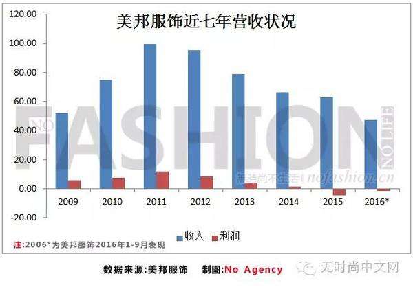美邦服饰的第三个拐点是2012年。2012年,国际品牌在中国市场基本站稳脚跟,这亦是本土品牌衰退元年。美邦服饰正是从2012年开始衰退,这一年的标志性事件为十八大、反腐、中国经济放缓的危机。2012年,对于全球零售业、奢侈品行业来说,都是可以看做是标志性的一年。在此之前的2011年,美邦服饰收入接近人民币100亿元,为99.451亿,净利润12.060亿元。