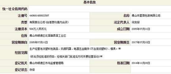 从全国企业信用公示系统查询可知,星澳生产经营范围包括泡沫塑料包装品、风扇网罩、电器五金配件(不含废旧塑料)、模具等,法人为何奕报。同时,何奕报也是安徽芜湖美威空调设备有限公司和佛山美威包装品有限公司等多家企业的法人代表。