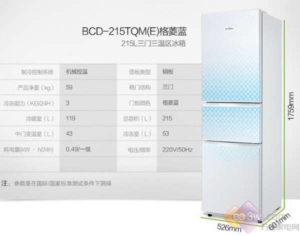对于普通小家庭来说,家里有一台三门的实用冰箱就比较好。本期小编就为大家推荐一款经典热销的三门冰箱,这就是美的(Midea)BCD-215TQM(E)冰箱。蓝色菱形,格子设计;简洁时尚,优雅百搭。暗扣手设计,防碰撞设计,安全贴心实用。