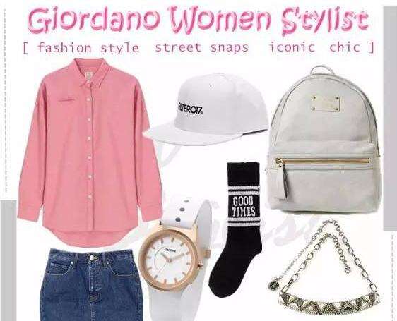 韩国时尚文化可是近年十分流行,小编也不免要跟风一下!珊瑚红衬衫搭配包臀牛仔短裙,下身搭配nike运动鞋,配件方面是这次造型比较着重的,用白色元素使造型更加青春可爱,cap帽、手表还有韩版包包,都是很百搭的配饰喔!