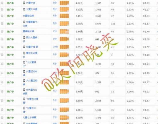 这款牛仔裤的宝贝,看上去推广的还不错,出价不高,点击花费也不多。原因,就是因为这几个词的质量分是满分,整体的权重高,才能靠低价获得好的排名,有一个降低的ppc。