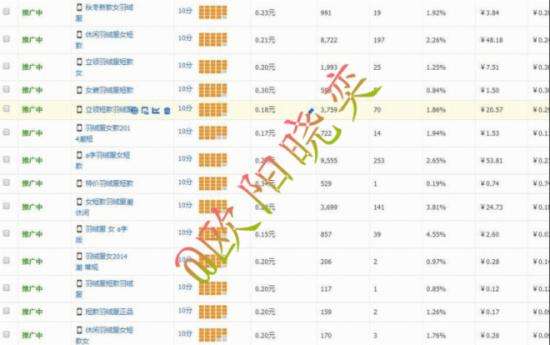 拿去年老的数据做个对比,一款羽绒服的宝贝,满满的10分关键词,各位注意看出价和ppc,对于女款羽绒服来说,出价已经很低了。但是ppc更低,这就说明,直通车权重高,可以出价更低,依然能拿到流量。