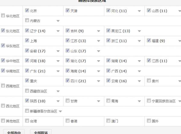 8、投放地域:可以通过生意参谋查看数据,了解不同地域对于宝贝的购买欲可以选择性的投放。一般港澳台国外不建议投放的,即使成单如果运费设置不好也是个大麻烦,国内省份可以选择投放,每个省份的每一个市也可以选择投放。