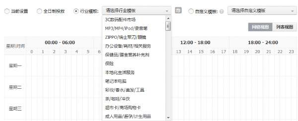 7、投放时间:可以根据行业选择行业模板或者根据店铺每天流量情况自定义设置,投放比例在30-250的整数,流量少的阶段根据店铺的需求可以选择不投放。