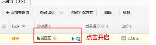 在关键词列表,开通智能匹配功能(默认是暂停),如果掌柜们开启了智能匹配也要定期观察后台的关键词情况,对于点击不好或者展现不好的关键词进行删除。